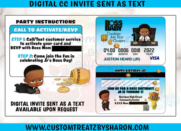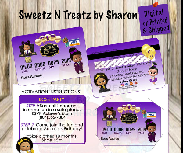 African American or Caucasian Boss Baby Girl Credit Card Invites