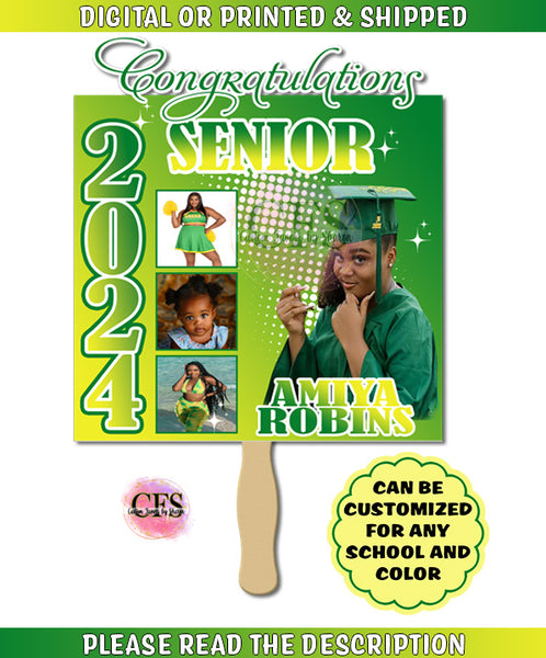 First and last name of person, high quality picture, and the year you would like on the fan. also its a 2 color choice i need one color for the banner and one color for the graduates name. people use their school colors but its totally up to you.  Please specify the date you need your order by.  Please order in advance in enough time to receive your order timely.